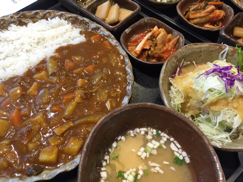 キムチとともに食べるおそばやカレー。
