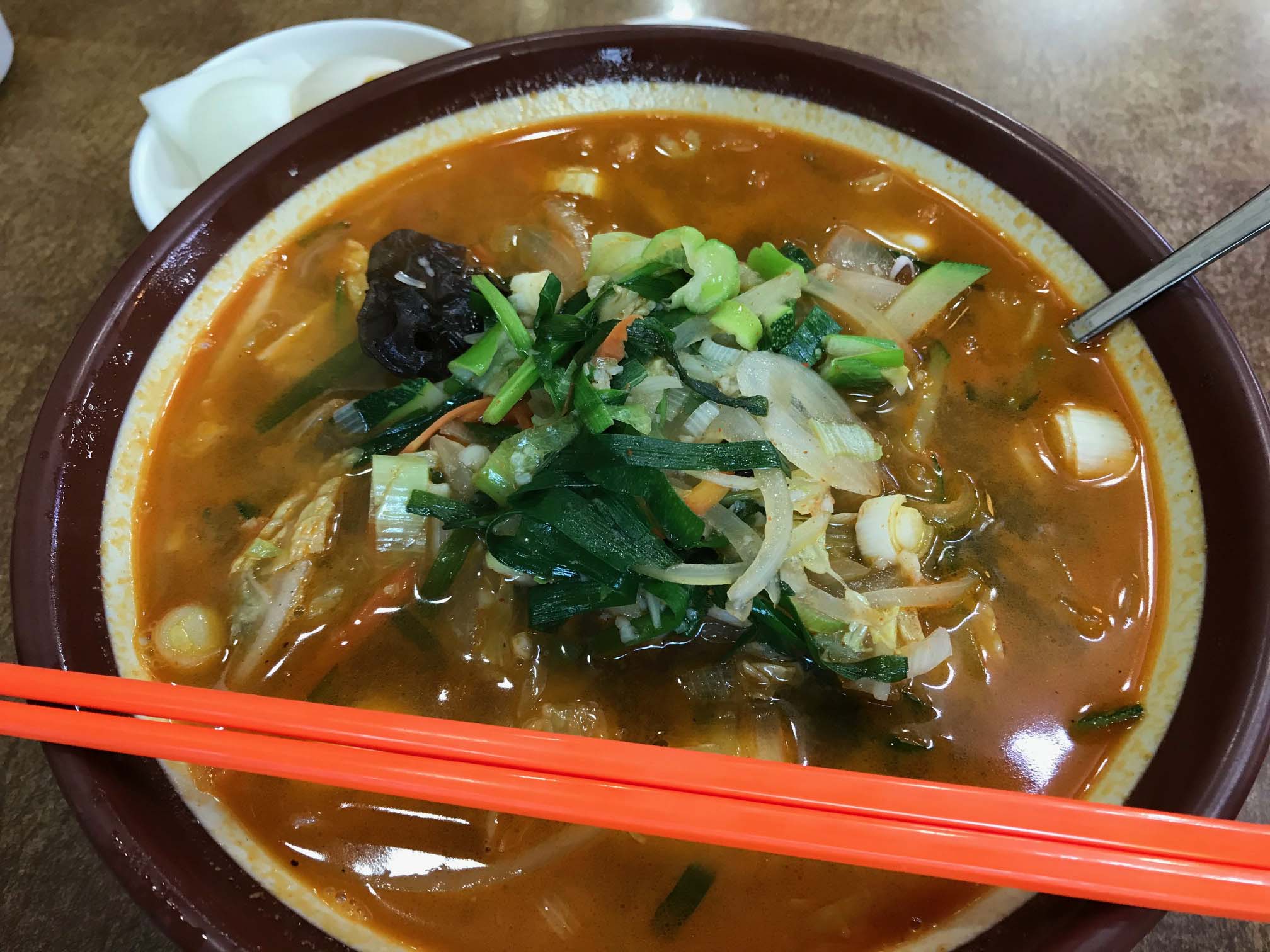 先日、仕事の合間にふとチャンポンが食べたくなって、久々に「新興館」へ。ここは海雲台で一番古い中華料理店で、海雲台の人がチャジャ麺やチャンポンといえば、この店の名を挙げます。(※釜山で一番古いといううわさも。次回、店主に確認してみます)。私はここでチャジャ麺は何度か食べていますが、チャンポンは初めて。辛すぎるのは苦手なので、辛さ抑えめで注文しました!野菜の下にはイカやエビなどの海鮮もたっぷり。まろやかなスープはほどよい辛さ(通常は辛いそうです)、麺の茹で具合も絶妙で、とってもおいしかったです。後日、友人に話したところ、友人はチャンポンよりチャジャ麺派とのことでしたが、私的にはチャンポンをおすすめします!